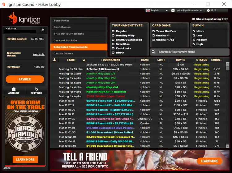 Ignition Pokers premier tournament series is the Black Diamond Poker Open. Give yourself minutes to set it. Check out wwwignitioncasinoeu or just click here.